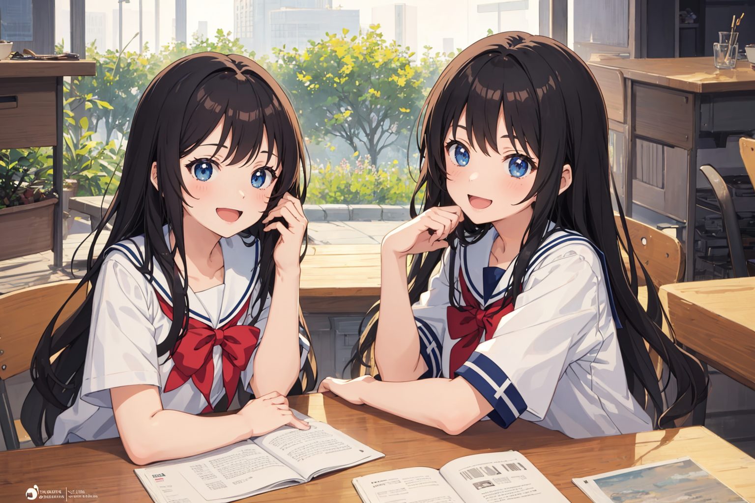 (masterpiece:1.2), illustration, (anime styles:1.2), flat styles, 2 girls, cheerful, :D, smile, school uniform(worst quality, low quality:1.4), (zombie, sketch, interlocked fingers, comic), realistic(masterpiece:1.2), illustration, (anime styles:1.2), flat styles, 2 girls, cheerful, :D, smile, school uniform