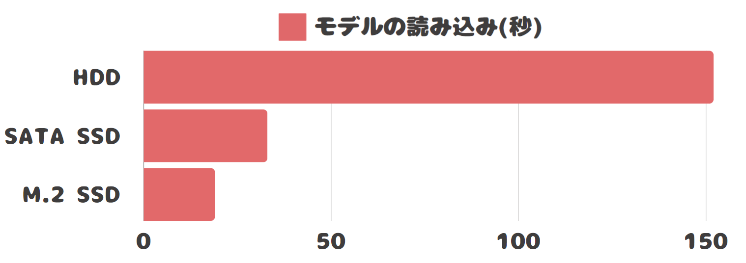 画像生成時にはそんなギガバイト単位のファイルをストレージから読み出すわけなので、ストレージからの読み出し速度は結構影響しそうです。